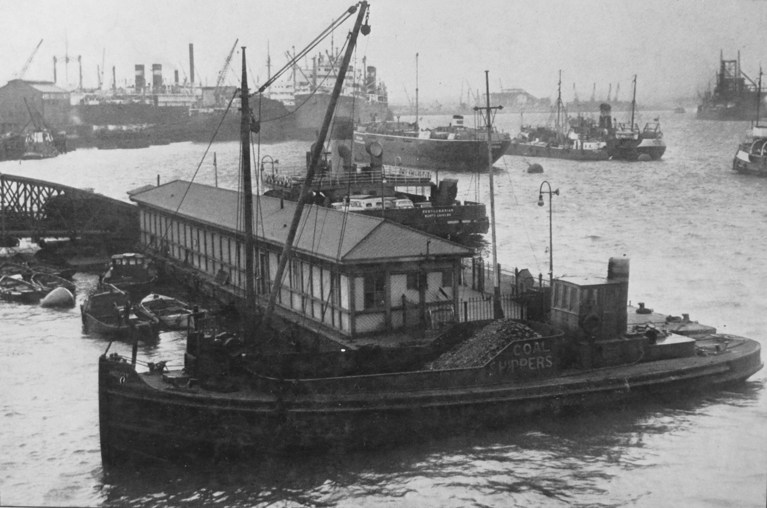 The tug at the extreme left appears to have France Fenwick funnel colours and in the background it seems that the Ore Quay gantry is under construction which would date the picture in the fifties. The funnel colours on the barge could be those of trawler owners Richard Irvin & Sons who still operated numerous steam trawlers then.
