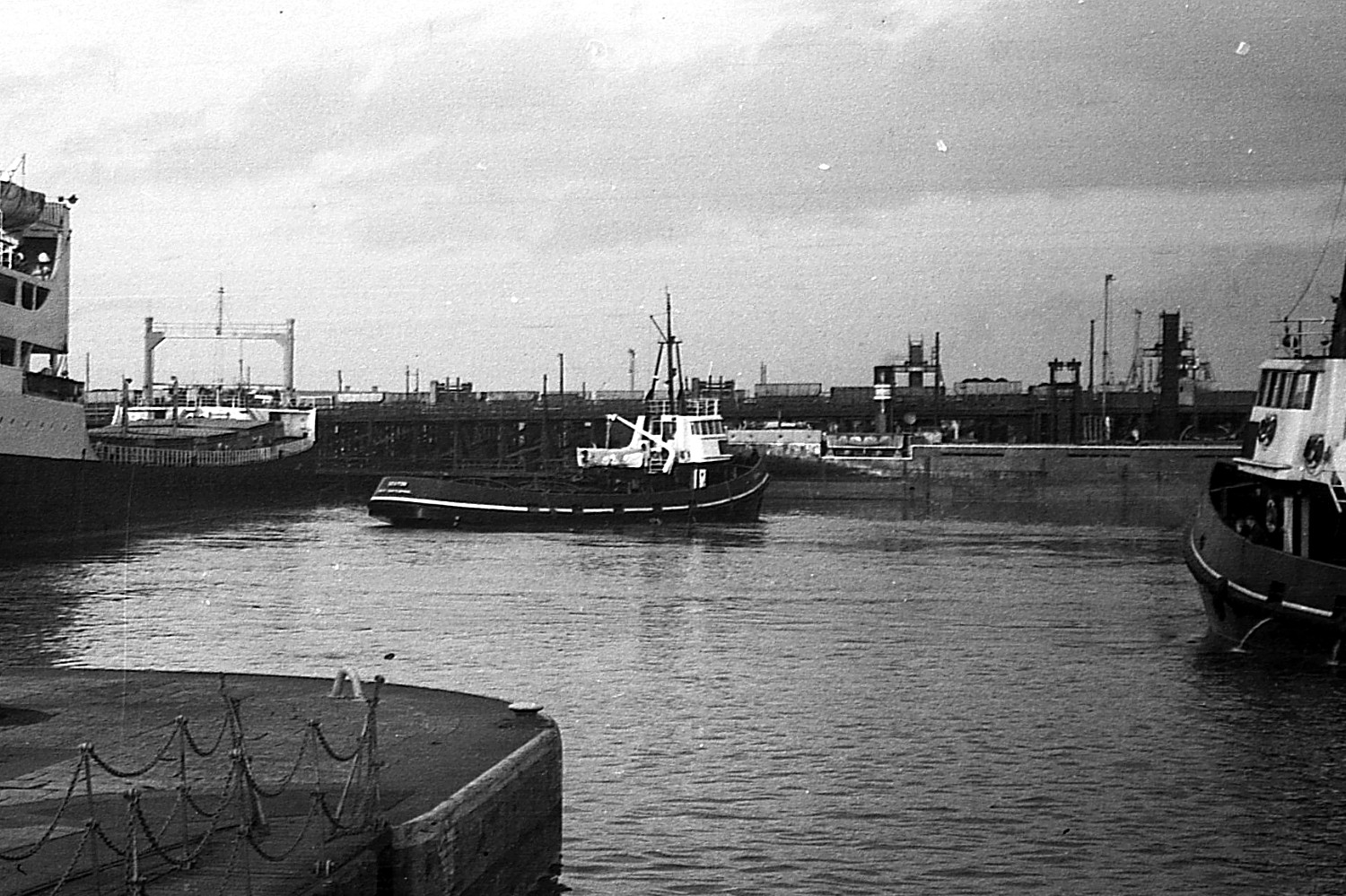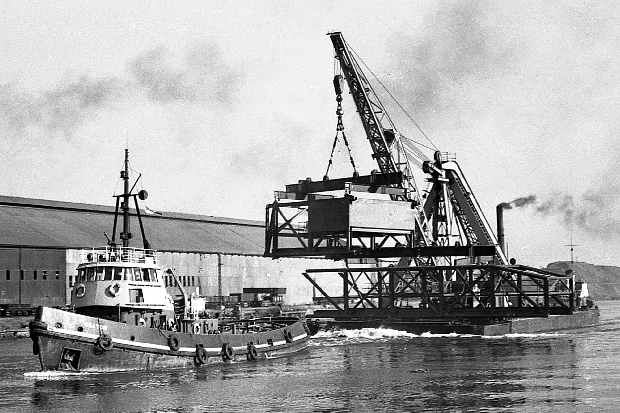 The SEATON, now in service on the Tees with Tees and Hartlepools Port Authority, towing the TEES FLOATING CRANE in the upriver reaches with buildings in the background I cannot now remember! 13 June 1968: