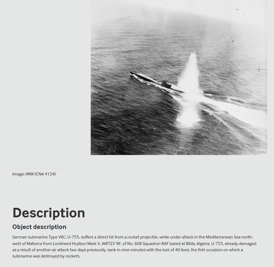 RAF 608 County of York ( North Riding ) Squadron by mid '43 was equipped with the Lockheed Hudson operating from fields in North Africa tasked with shipping strikes, their success against U755 on 28 may illustrated here, by their Hudson 'M' was the first such submarine sinking with a deployed RP-3...