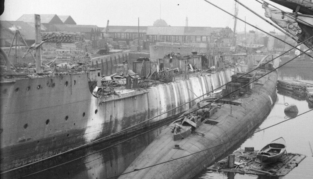 If the photo below shows, may be the Stb side of H 60, the ship in the centre, what little is left, would appear to have two large SW inlets for condenser cooling.