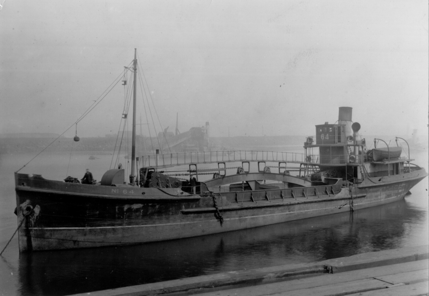 Interesting photograph, Dick ? was her Chief Engineer, it looks like she is anchored off the Graving Dock Jetty most probably getting some stores which were held at the Graving Dock, looks like No10 Dredger in the background. 64 had an unusual Bridge in that it was basically a riveted metal box which was I presumed from her Wartime Service as I do remember that she had so I was told been used for carrying Military cargo in WW1 or STUFT in modern day terms. The other unusual feature she had was that she had a Porthole in the Bulkhead twixt Stokehold and Hold the glass was still affixed with the Deadlight closed.