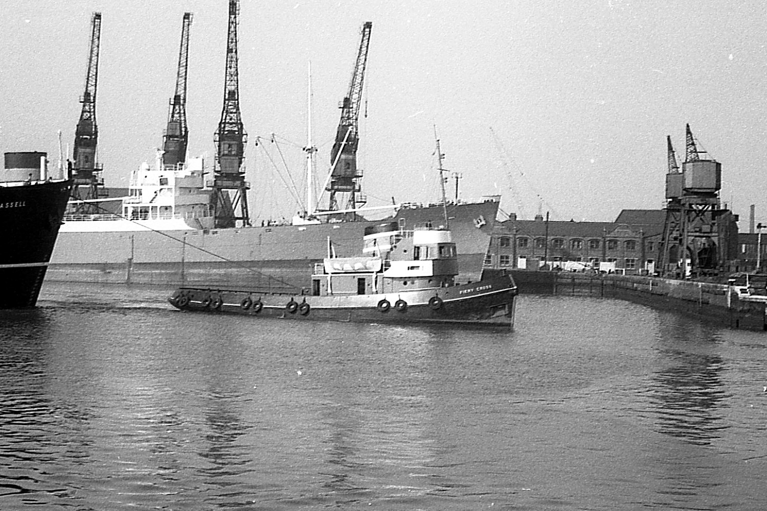 The FIERY CROSS is towing the LASSELL towards the Middlesbrough Dock lock exit with ROWALLAN CASTLE in the background (both these vessels will feature separately later).