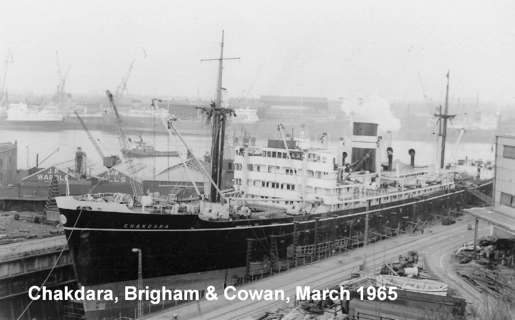 British India's Chakdara, built by Barclay, Curle & Co in 1951, in Brigham & Cowan in March 1965.
