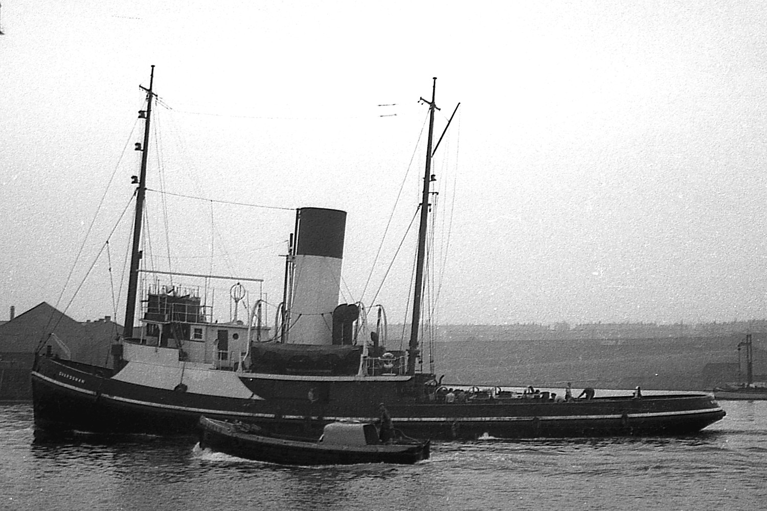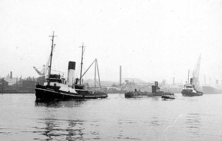 The Humber tug GUARDSMAN towing HMS SENESCHAL (S75) past Wallsend on the River Tyne