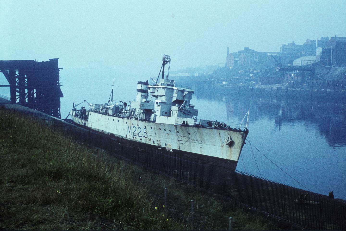 The Algerine class minesweeper Rinaldo on 23 September 1961. She had arrived on 16 August for breaking by Dorkin and is seen here on a temporary berth just above the old Redheugh Bridge .