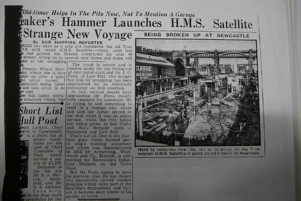 In the correspondence about HMS Satellite elsewhere on the site were questions about where and by whom she was scrapped. The copy of a newspaper clipping attached seems to show her on the North bank of the river above the High Level Bridge at Phoenix Wharf ( I had thought this was on the Gateshead side.). She had been bought by a Mr Potts of Low Fell and this may have been his only venture into shipbreaking. Also of interest is that a 4" gun mounting went to the Museum on the Town Moor - perhaps it is somewhere in the Discovery Museum.