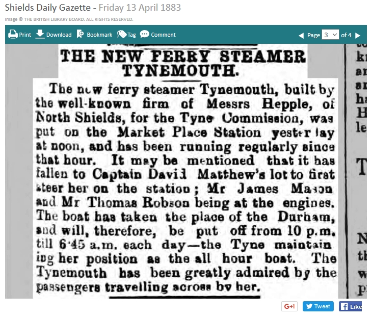 Well, the ferry appears to be TYNEMOUTH and there's only 2 Tynemouths listed in MNL 1904. One is certainly a cargo ship and the other a smaller paddle driven craft owned by the River Tyne Commissioners and built in 1883 at North Shields. This would confirm something that I have wondered about for some time. Was the Hepple built TYNEMOUTH of 1883 a ferry or a tug? It looks as though she was a ferry. Thank you Sir.