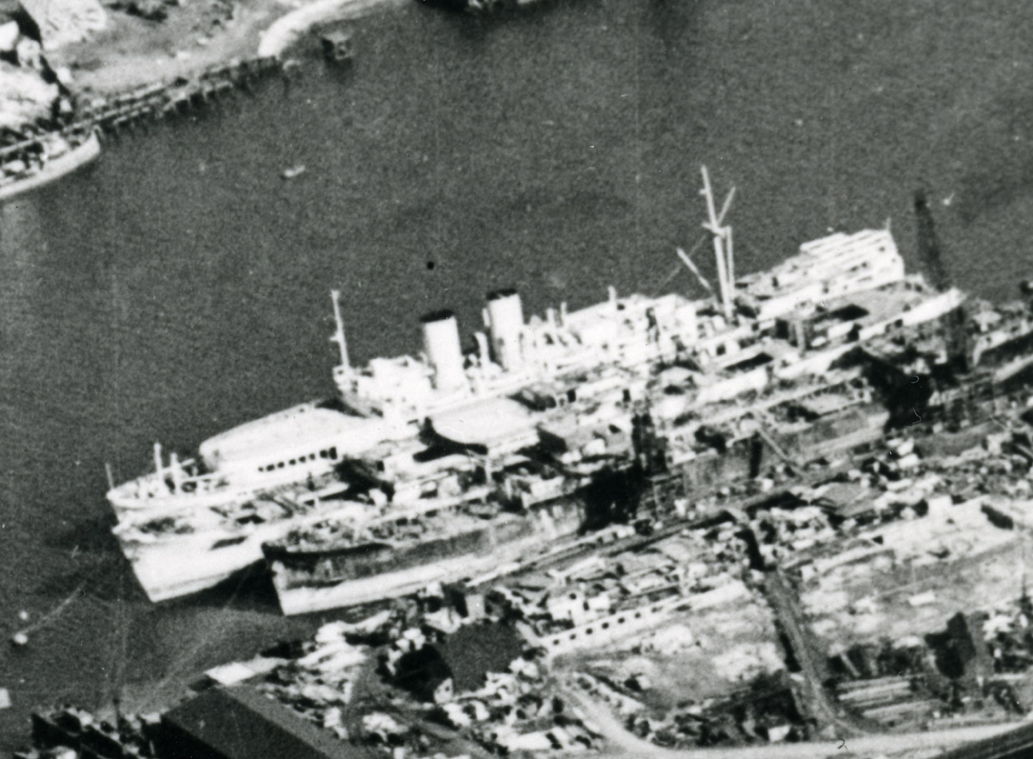 Sean, a very helpful observation which proves we did not look closely enough at this trio of vessels .... the two inside seem to be part-completed cargo vessels, there is a flat section in the centre one (just below the forward funnel of the white ship) which may be the base for her bridge structure. The inner one looks rather 'worn' so may be a repair job.