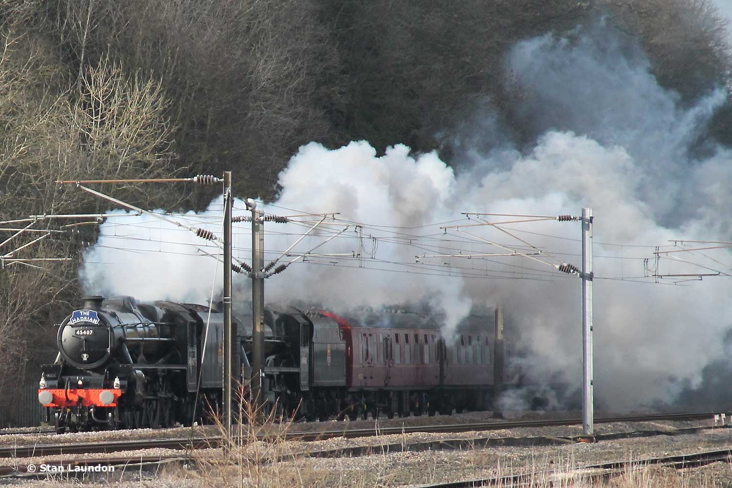 The LMS locomotive (4-6-0) 45407 “The Lancashire Fusilier” (LMS 5407) was built in 1937 in Scotswood, Newcastle. She is seen here passing through Ferryhill on March 7th, 2015 hauling “The Hadrian” with the LMS Jubilee Class number 45690 “Leander” in tow.
