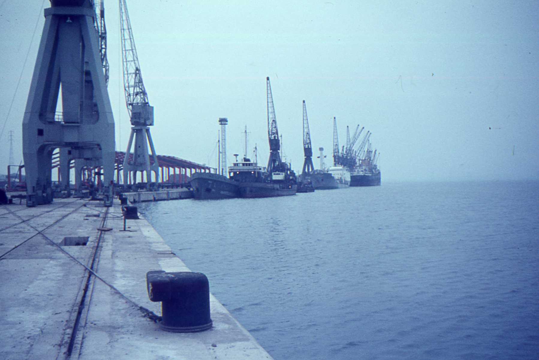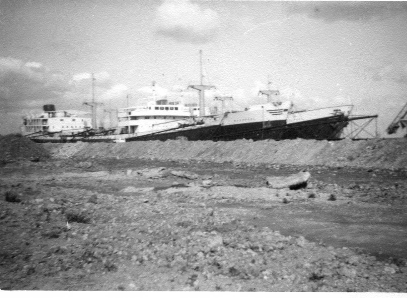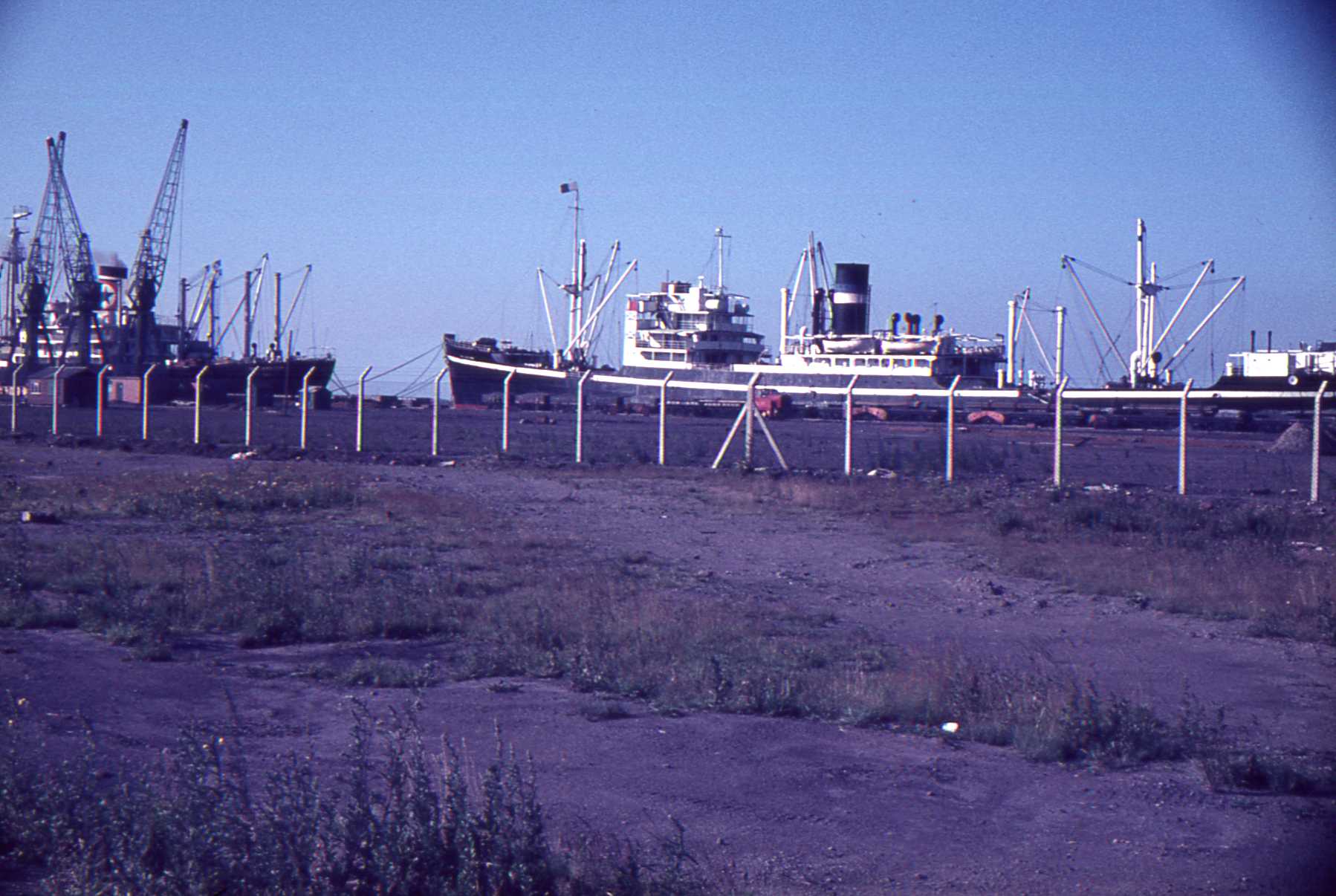 A view along the dock in 1963 with a ship on No.1 berth and a few of the Dutch dredging craft.