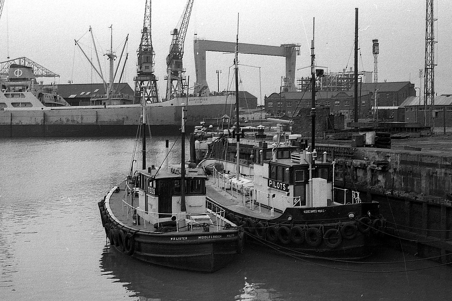 On 28 July 1973 the three pilot cutters lined up abreast in Middlesbrough Dock were the A.G. MURRELL, W.R. LISTER (both normally in service at Hartlepool) and the W.W. CONSTANTINE (39gt, completed 10.1956). In the background is the MARMARIS I. This next shot shows the ALDERMAN B.O. DAVIES (42gt, completed 7.1955), with the W.R. LISTER inside. The view was taken on 9 May 1973 when I also took a colour picture - although the resultant scan is not brilliant!