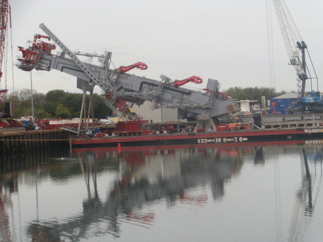 Depending on who tells you what the ship has not been built or has been built but the owners refused delivery and told the Chinese it was unseaworthy and to scrap it. Anyway the operation to load it onto the barge, it is now going to Battleship Wharf for 'storage', has had to wait until now for suitable tides.