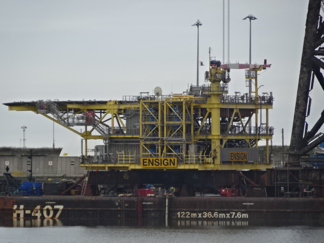 The jacket and ENSIGN topside have since been rolled off the barge and moved to an area at the back of Battleship Wharf for decommissioning