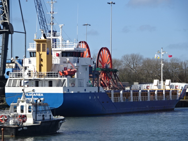 Looks like she came in to collect the reel, photo's on the web show her with project cargoes on deck like turbine towers and blades