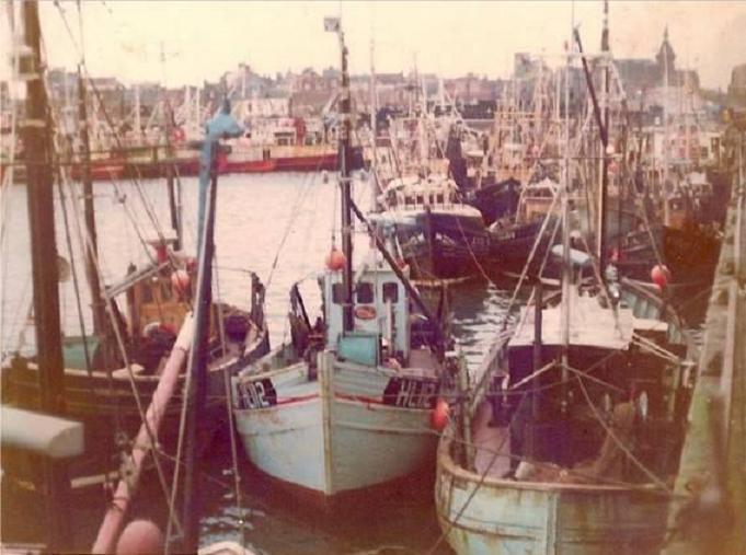 Picture shows a crowded Fish Quay during the winter with Danish Trawlers sheltering(Red Boats) from poor weather....