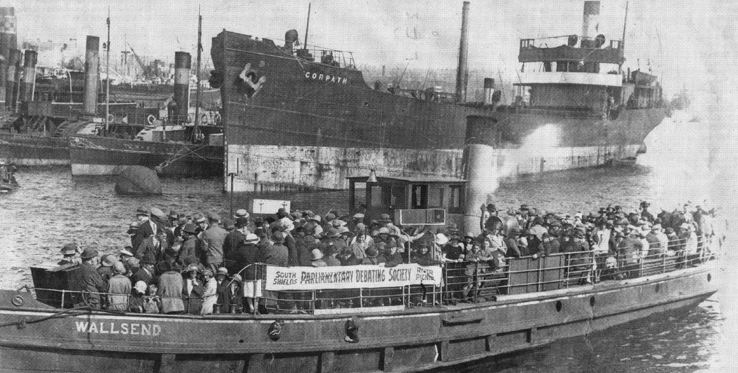 This photo was in tonights Shields Gazette and shows the ferry Wallsend out on a river picnic with the South Shields Parliamentary Debating Society. The article has the shot as taken at Wallsend but methinks it is Shields. The first tug after the Corpath is the Washington.