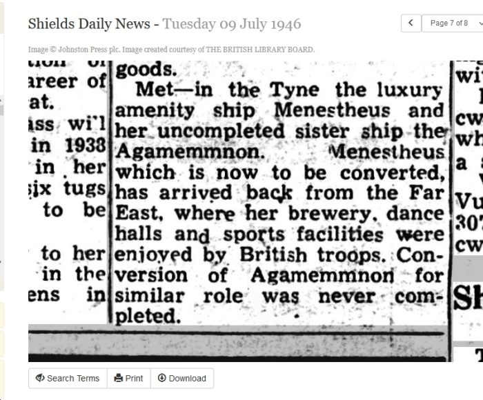 The following articles suggest that the Wiki entry is inaccurate in that MENESTHEUS was completed and went to the Far East whereas AGAMEMNON was not completed.