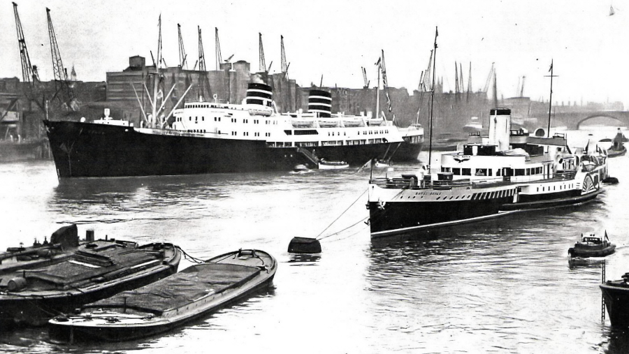 Interesting view of VENUS in her original form with flat-fronted bridge and a lower foredeck. After being a guest of the German Government and being sunk by us at Hamburg, she appeared in a more modern form with raked stem, new funnels and changes to accommodation.