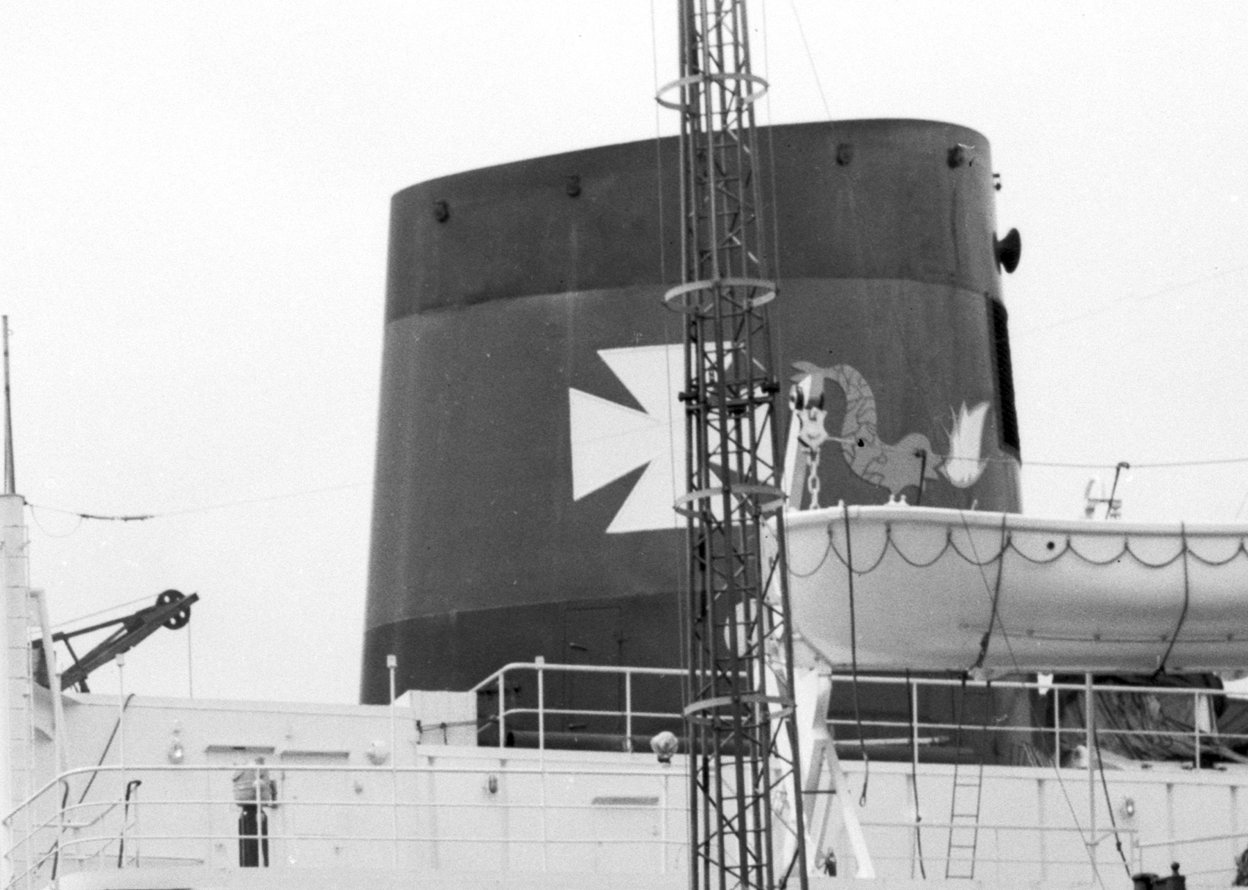 An undated view from the 1960's. The dry-docked vessel is sporting a curious figure on her funnel ahead of the Houlder symbol, her name ends with the letters YWELL