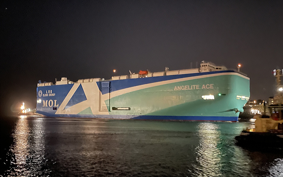 Vehicle carrier ANGELITE ACE inwards past North Shields in the dark 19/12/2025. Photos by Richard Athey.