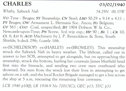 Wrecked on 03/02/1940 at Saltwick Nab, south of Whitby on a voyage from the Tyne to Bruges with coal