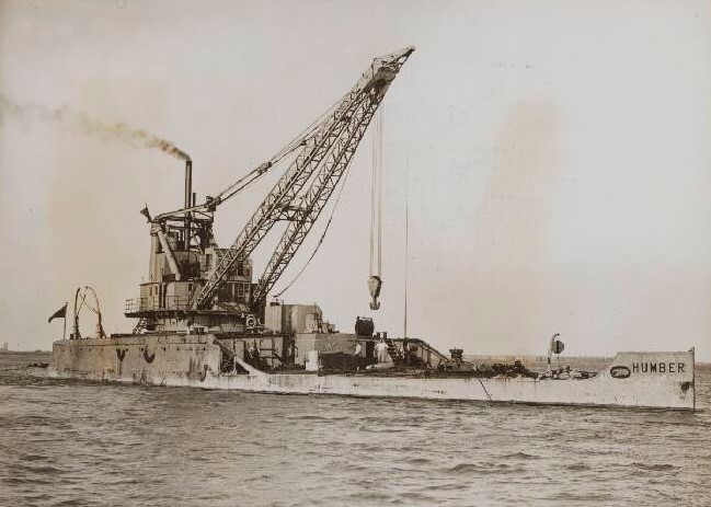 which the Dutch shipbreaker Frank Rijsdijk thought was a grand plan with huge benefits. Firstly she was well maintained, low mileage, well at least using her own machinery which in turn meant she was self propelled, had loads of deck space for landing broken and twisted metal and once the entire 6" gun, magazine/shell rooms were removed a huge capstan was installed whilst the conning tower was a perfect control position and she still floated in shallow water. When and where all this was accomplished is obscure but old Frank knew the ropes, additionally having his thumb in many dykes and British breaking outfits especially Upnor, once he'd fitted a 90 ton crane this well known photo of Humber, where he considerately retained her name, was taken during the salvage of destroyed battleship Bulwark in the Medway july 1935. Her post WW2 history is obscure.