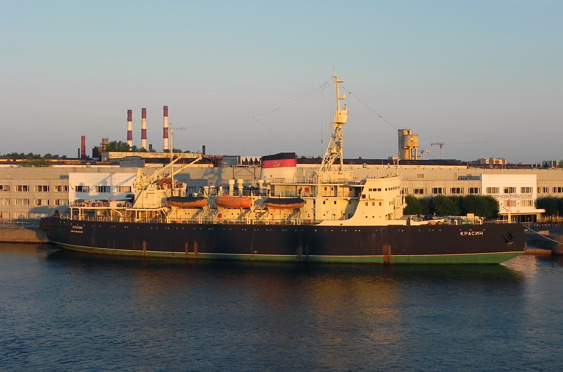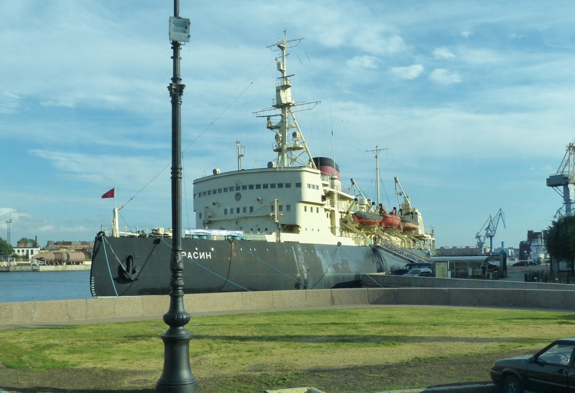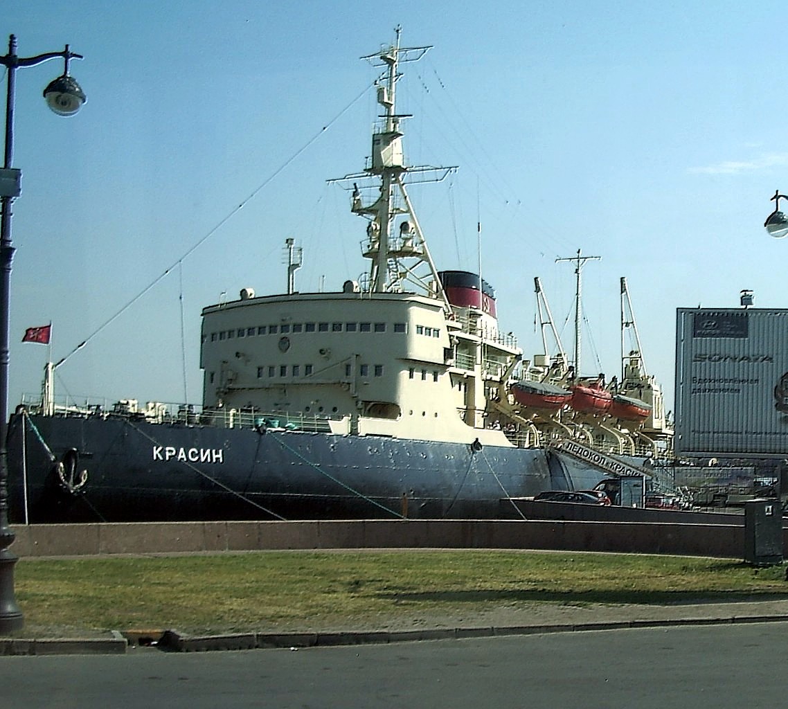 The preserved Russian icebreaker KRASIN in St. Petersburg, 9/8/2014, in the early morning sun, and later from the nearest bridge.