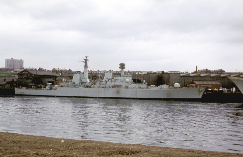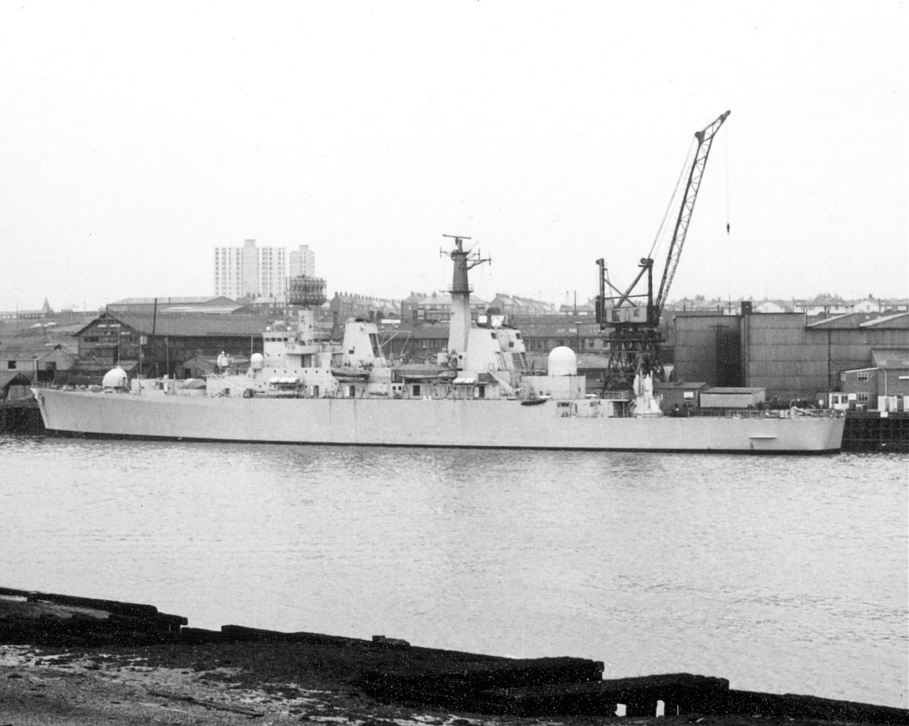 Almost complete on 28 August 1972. The first fit of the Mk 8 4.5 inch gun - seen at a hgh angle of elevation, the first UK fit of the Ikara Anti-submarine missile - cover visible aft of the 4.5 inch gun, the first fit of the Sea Dart AA missile - launcher visible aft and the first fit of the associated 909 guidance radars - both visible without their radomes yet fitted. And, for good measure, two main propulsion systems - steam turbines and gas turbines. And knowledgeable souls called shipbuilding a low-tech "sunset" industry.