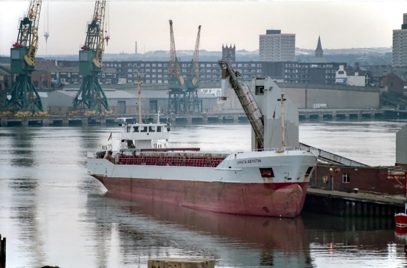 The coastal & river freighter Christa Kerstin, from Sietas at Neuenfelde in 1982 as Sea Este, in North Dock Sunderland on 17 February 1991.