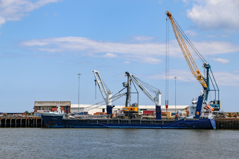 Loading Liebherr Crane parts at Greenwell's Quay because you can't get the ship upriver to Deptford,the river hasn't been properly dredged for nearly 30 years.