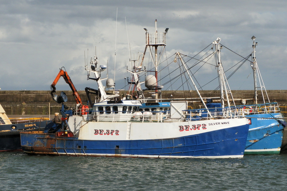 BF 372 SILVER WAVE was built in 1974 as Yard No.355 as H256 Radiant Trust for Hull owners. She moved North and was renamed FR 233 Primrose in 1992. In 1997 she moved to Northern Ireland as N 393 Vellee II and back to Scotland as BF11 Boy Ian in 2008. She took her present name in 2011 and is shown berthed outside her sister SHAULORA at Fraserburgh on 14/04/2013