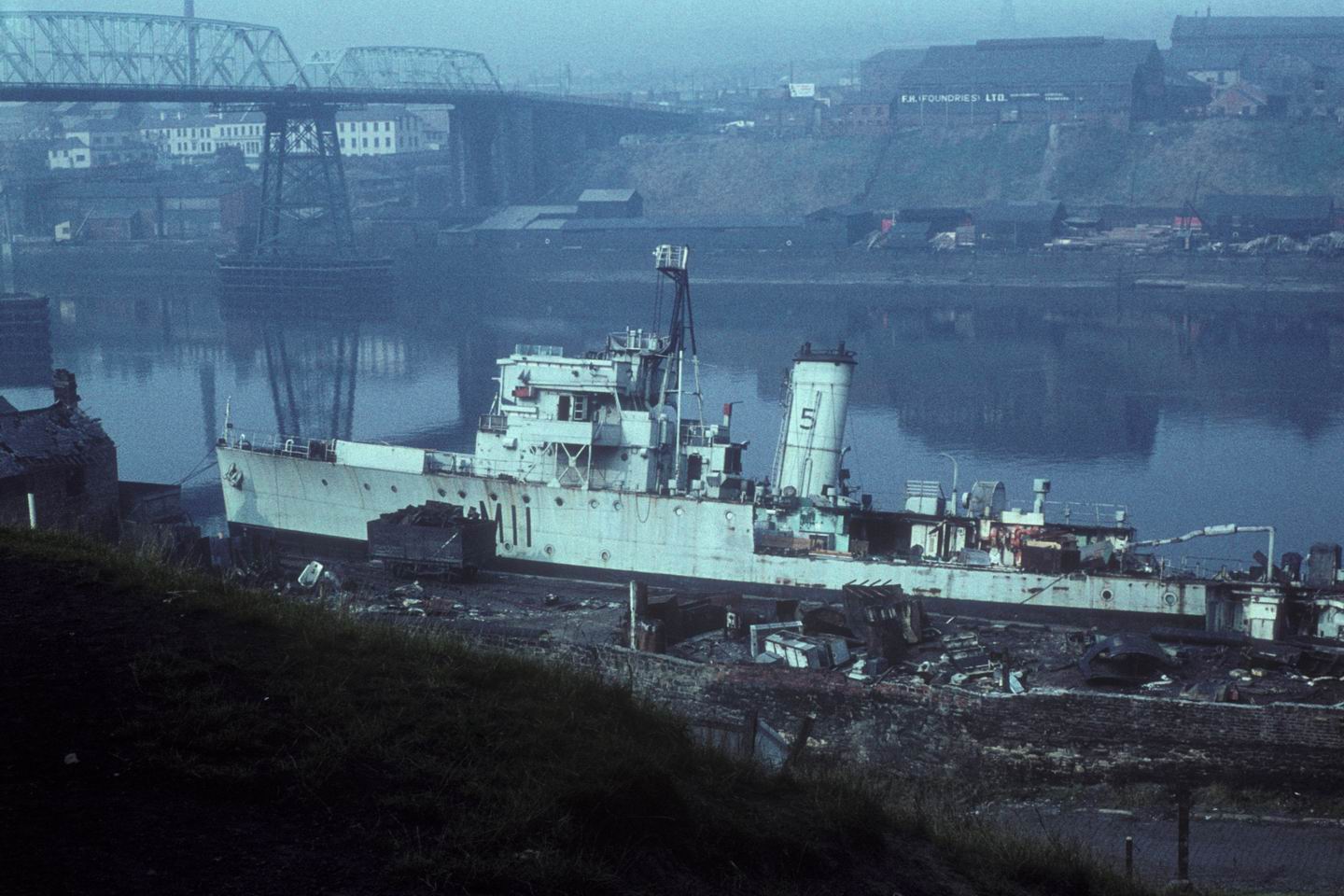 Whilst this is an Algerine class minesweeper it could not be Acute which was sunk as a target in the Mediterranean. It is also at Dorkin`s yard. King`s were above and below the King Edward Bridge whilst Dorkin`s were adjacent, above and below the old Redheugh Bridge. I think the picture may be from 1962 with Welcome M386 ahead and Wave M385 down river of her.
