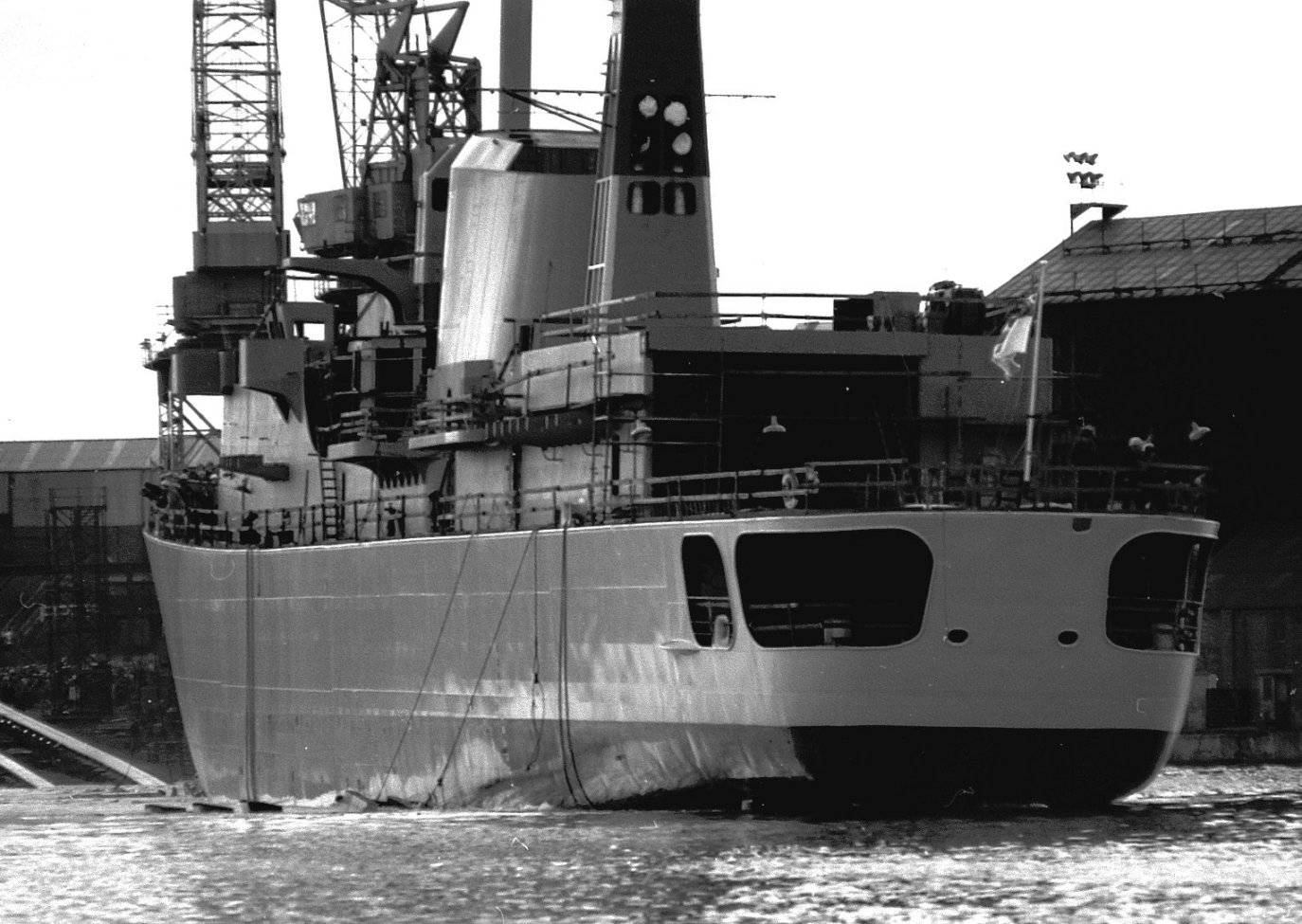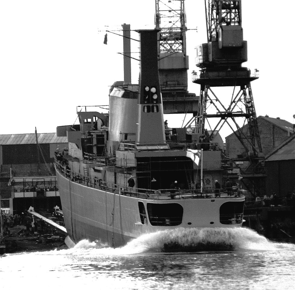 Exeter at Wallasend on 28 June 1980 - a few weeks before handover. Note the non-standard blue boot topping - the RN's first trial application of self-polishing copolymer (SPC) anti-fouling (slippery paint) - blue was the only acceptable colour available.