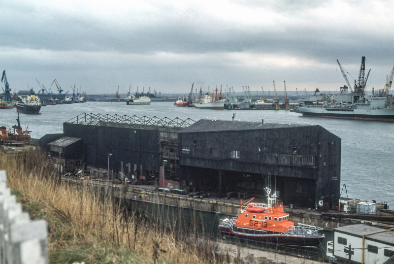 A view over Brigham & Cowan on 2 March 1980. The Arun class lifeboat George and Olive Turner appears to have taken up residence in the disused dry dock and amongst the dozen (at least) vessels in the background are: Saudi Prince at Commissioners’ Quay, a Fisher heavy-lift RoRo in the Albert Edward Dock, the Iranian oiler Kharg in dock at Smiths and RFA Tidepool alongside.