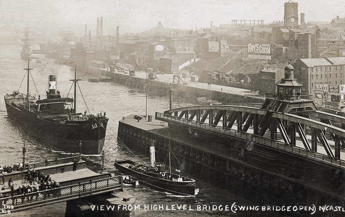 An undated view of an open Swing Bridge and a busy quayside, sent to me by Kevin Blair. One steamer heading for the open bridge unaided yet two more further downstream have tug assistance.